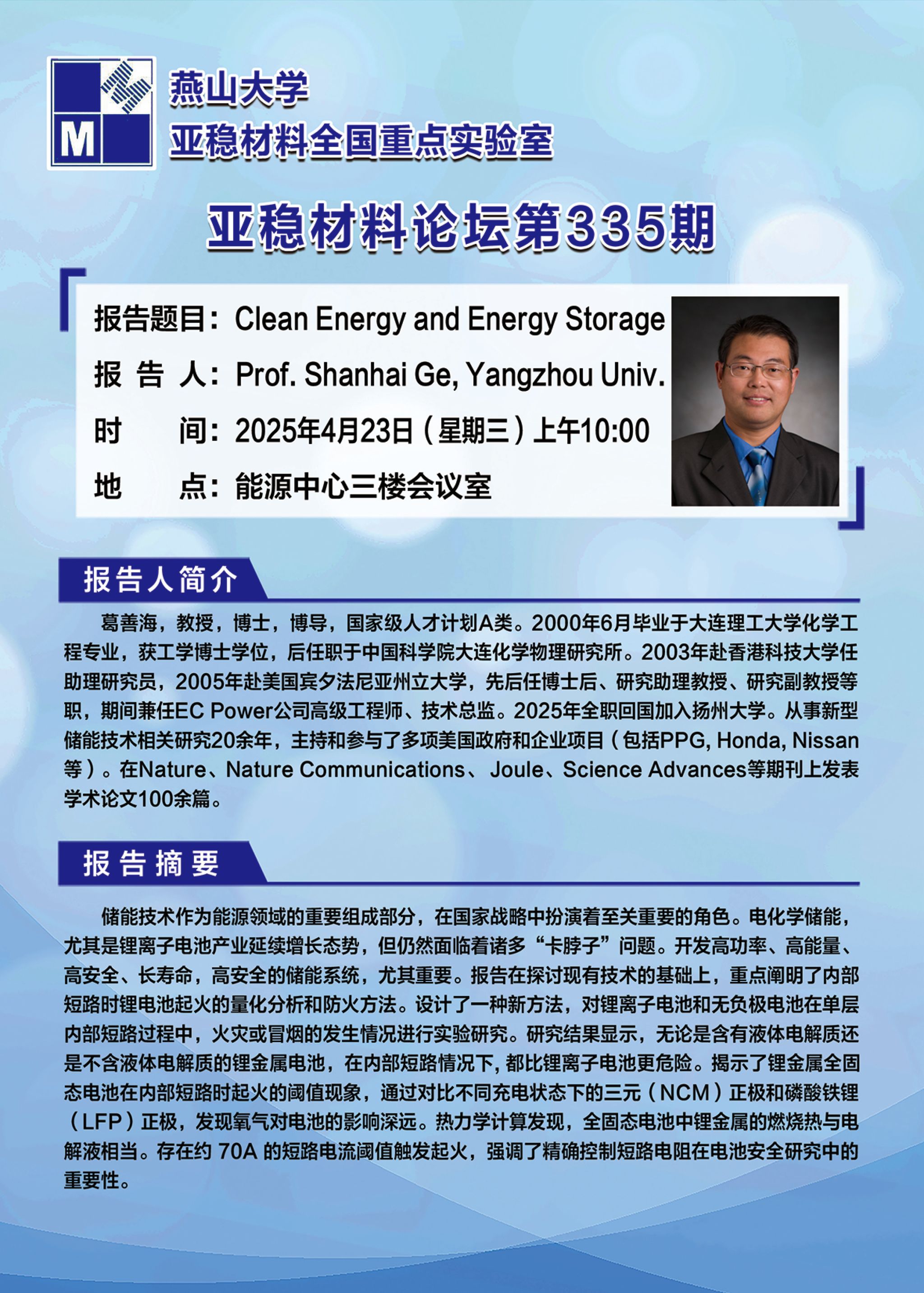 亚稳材料论坛第335期:Clean Energy and Energy Storage