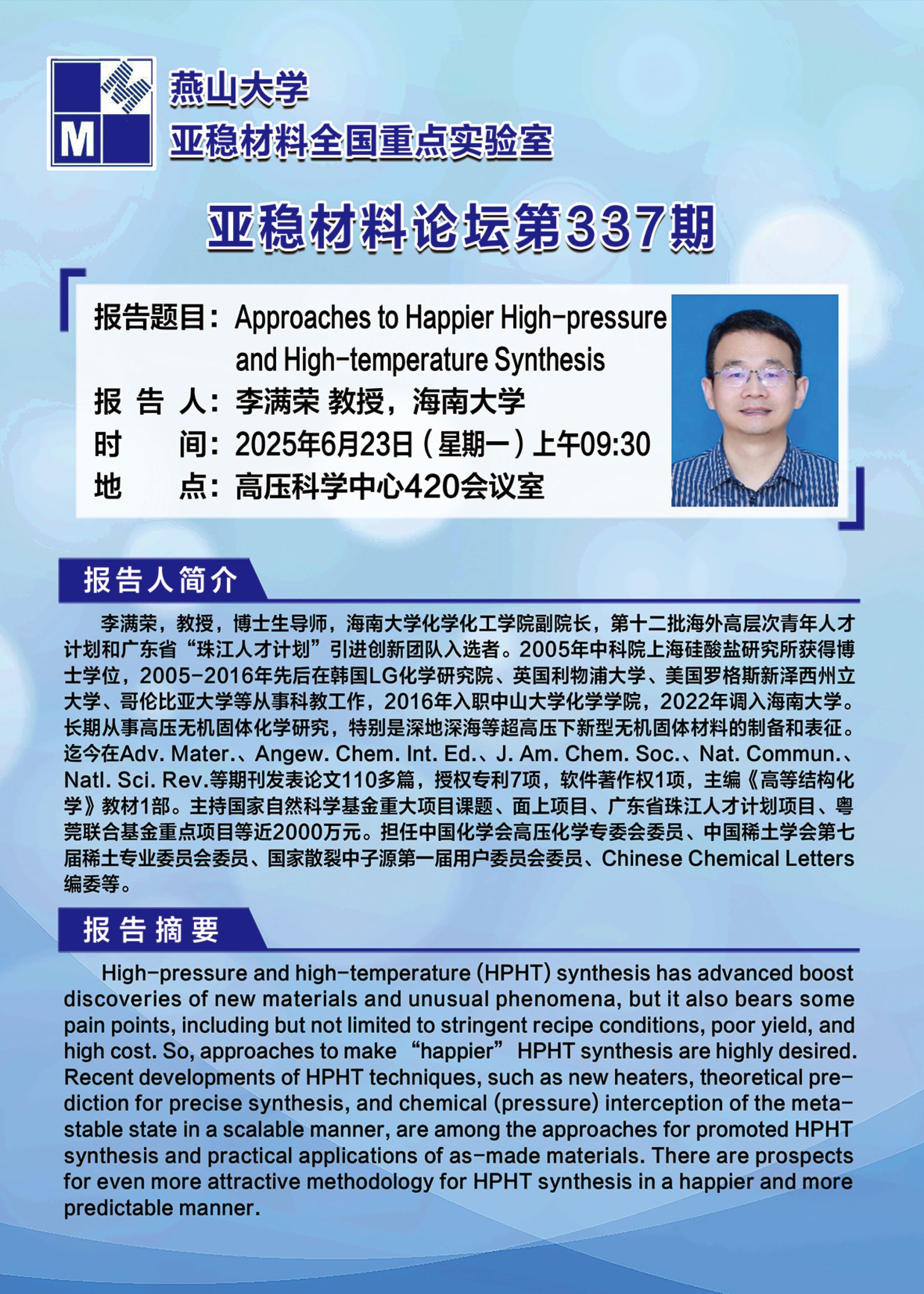 亚稳材料论坛第337期:Approaches to Happier High-pressure and High-temperature Synthesis