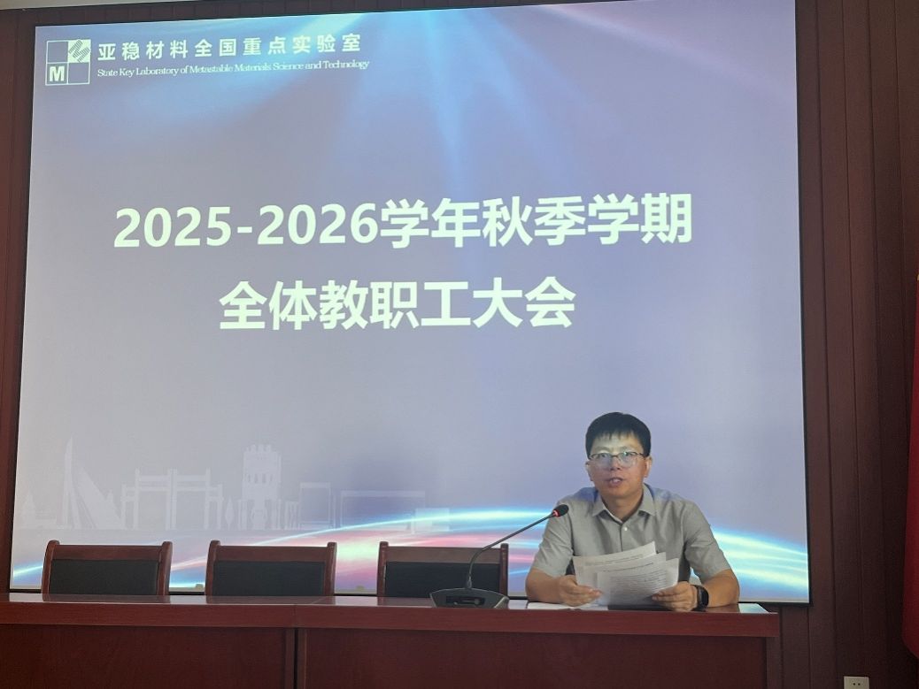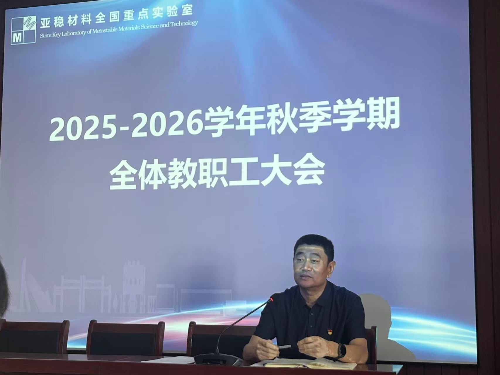 9月18日下午,亚稳材料全国重点实验室在材料馆A323报告厅召开了全体教职工大会。会议全面复盘上半年工作成效,系统部署下半年重点任务,为实验室下一阶段高质量发展擘画清晰蓝图。实验室党委书记张世良主持会议并作总结讲话,实验室彭秋明主任,温斌副主任、王鹏副主任分别作了工作报告。