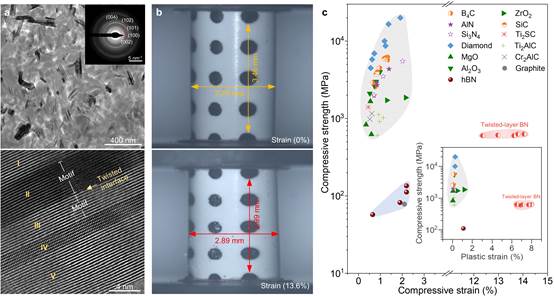 图为转角层状氮化硼陶瓷的显微组织结构和室温单轴压缩性能。a陶瓷由三维互锁的纳米片构成,每个纳米片由具有不同转角的层状基元堆叠而成;b陶瓷在室温下单轴压缩变形前后的照片;c转角层状氮化硼陶瓷与传统陶瓷块材的室温变形能力、塑性和强度的对比